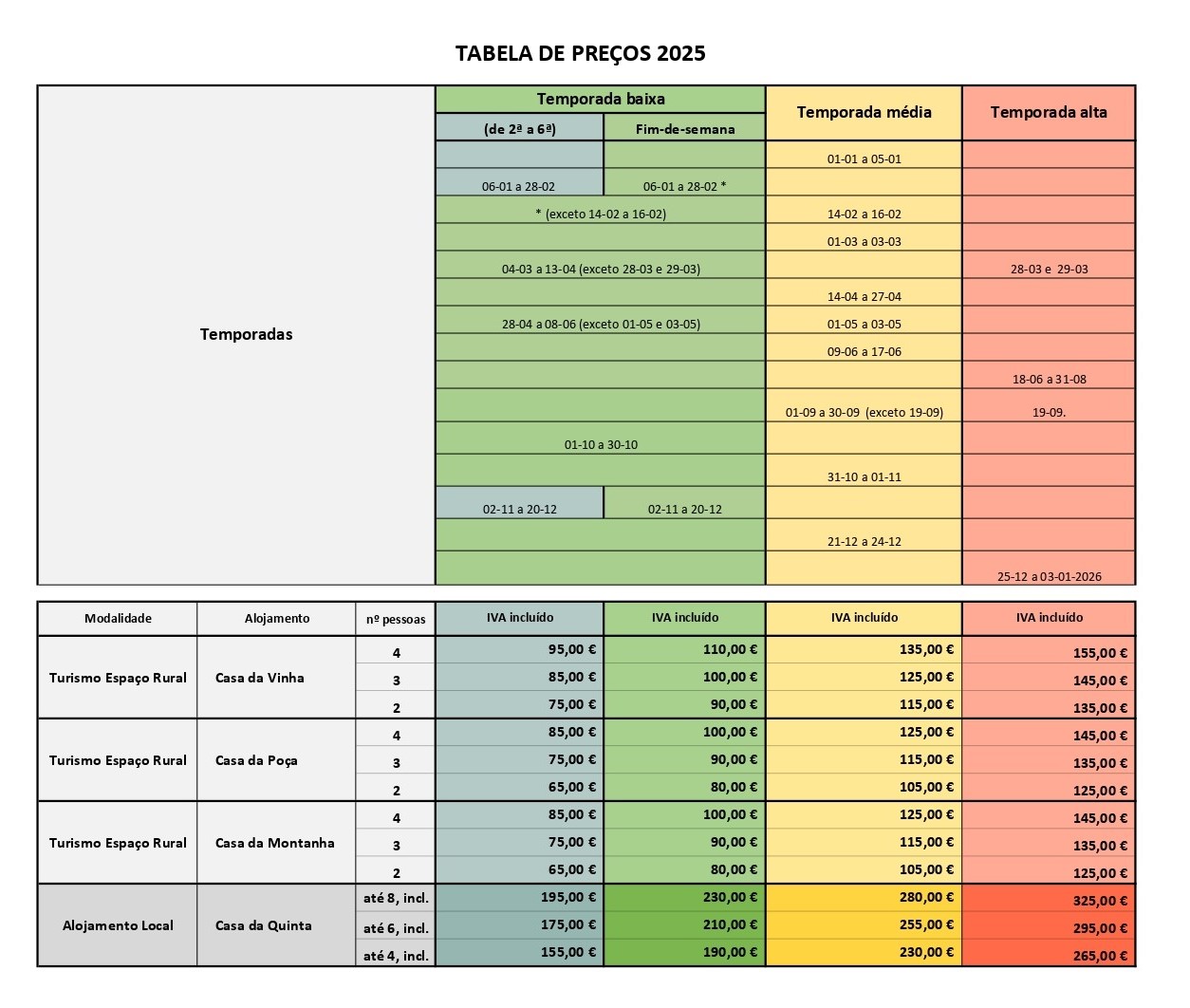Turismo em Espaço Rural: composto por três unidades de tipo T1 (casa da Vinha, casa da Poça, casa da Montanha) com quarto de casal, casa de banho, kitchenette e sala com sofá-cama duplo. Alojamentos equipados com TV, internet e ar condicionado. No exterior dispõe de piscina e churrasqueira.